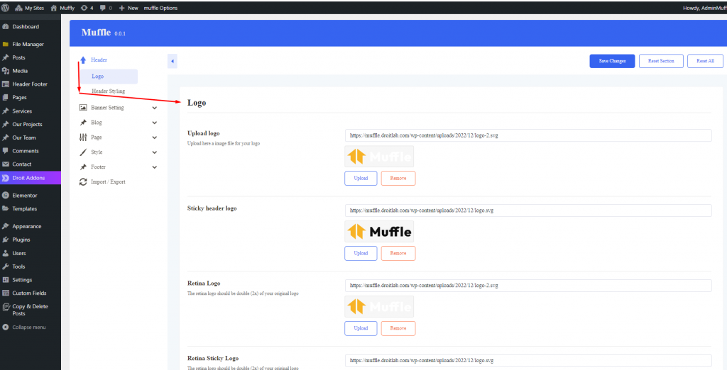 From the Header menu, you can add your website’s logo, sticky logo retina logo and so much more.